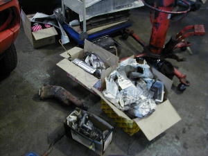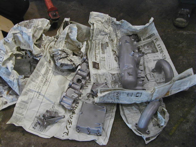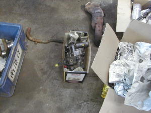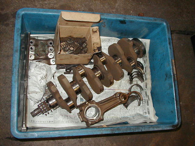 - <右>これから、作業に入るところでバラしたときのままのクランクシャフトや外されたメタル類が入った箱。