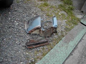 - 元のパテ盛りフェンダーも当然、両方交換。右側は、中古優良品。左側の黒い部分は、なんと新品です。